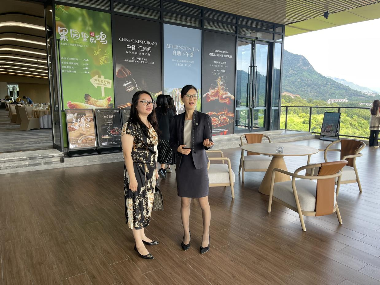 尹莉丽总监(右)向李文蓓院长一行介绍酒店