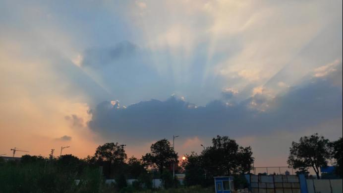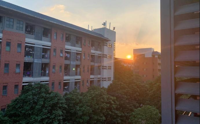 与阳台一角处抬头撞见落日一片。