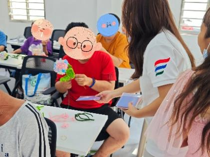 在社区学员们制作扭扭棒花朵的过程中,突击队成员也悄悄将前一天准备好的贺卡一一送到他们手中。这些贺卡是队员们在活动间隙写下的小祝福与鼓励,希望用最简单的方式,为他们留下一个小小的记忆。