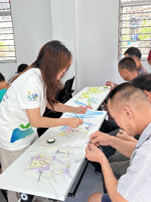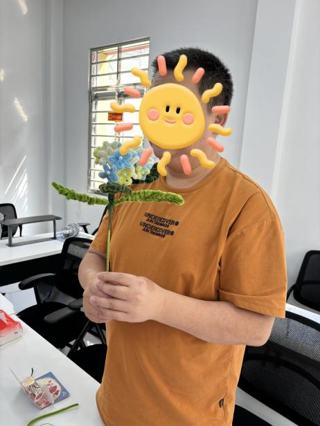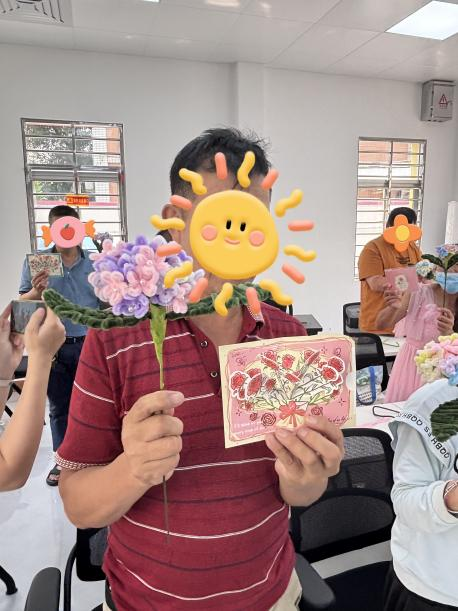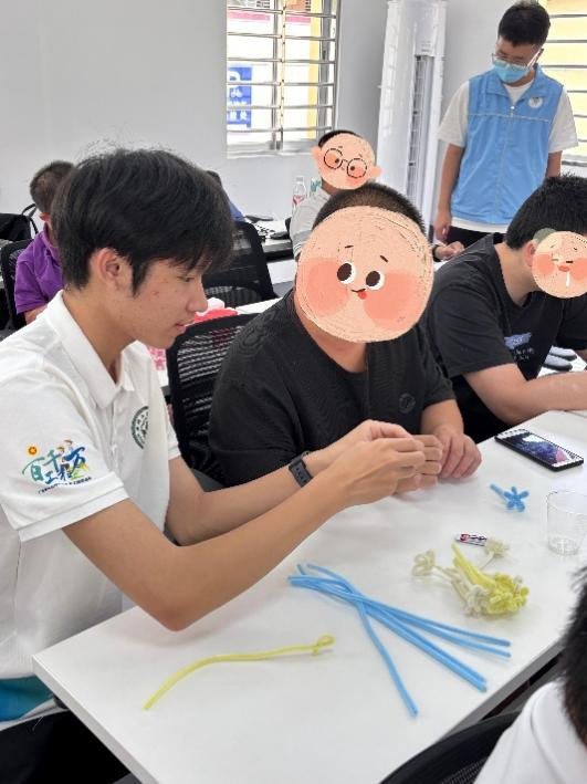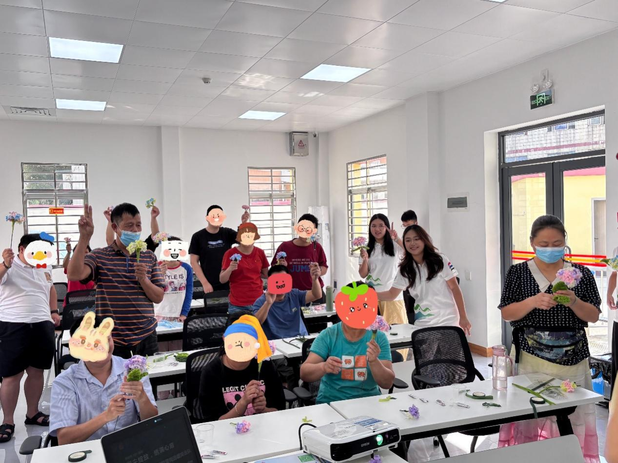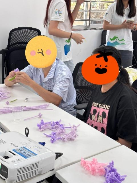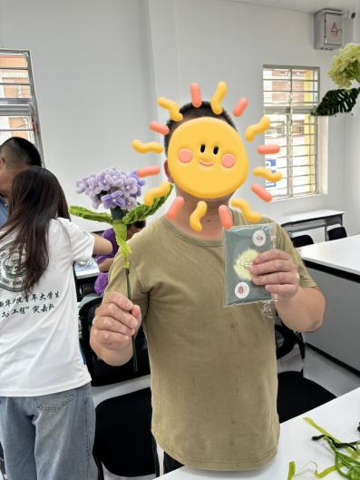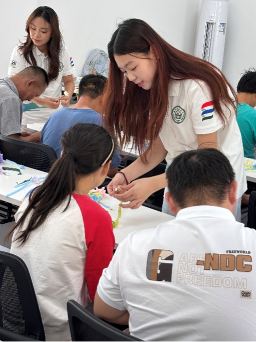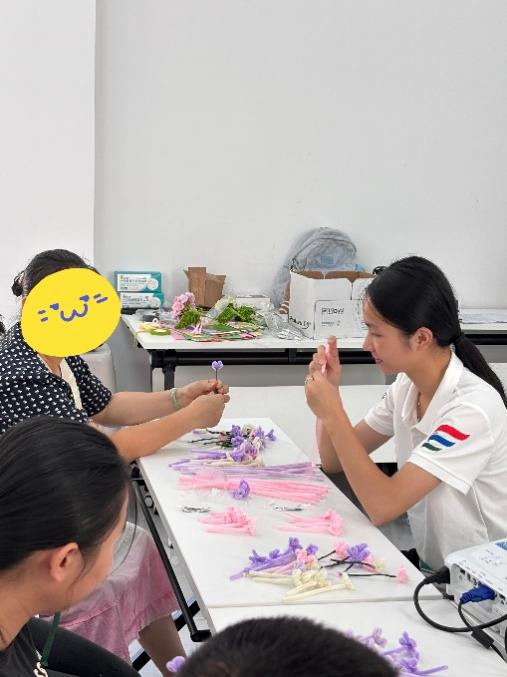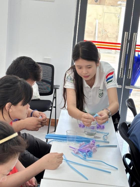 活动一开始,突击队员们便带着早已准备好的彩色扭扭棒、示范作品和满满热情,与学员们面对面坐下,一边展示制作步骤,一边讲解材料用法。学员从最基础的花瓣捏形学起,一步步地“扭”出属于自己的第一朵小花。
