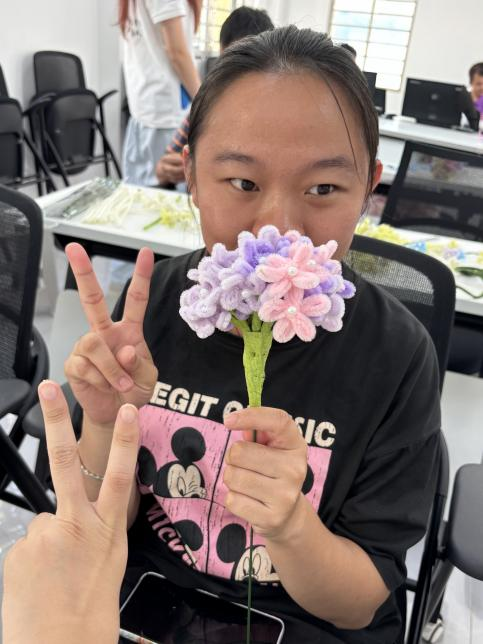 伴随着欢声笑语,桌面上的扭扭棒逐渐变成了一朵朵花,有的活泼张扬,有的内敛细腻,每一朵都藏着一份独特的想象。许多社区学员主动展示自己的作品,还与突击队员们分享自己的创作思路和“小愿望”。