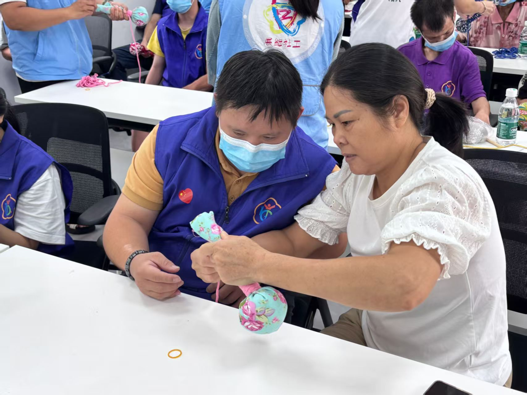 社区成员和家属一起动手,大家顿时热闹起来。社区成员和家属们坐在桌子旁,各自忙着制作手中的艾草锤,小屋子里满是温馨的气息。学生们穿梭在桌椅间,看到有社区成员遇到困难,便立刻上前帮忙,要么协助绑线,要么帮忙调整艾草包的位置。