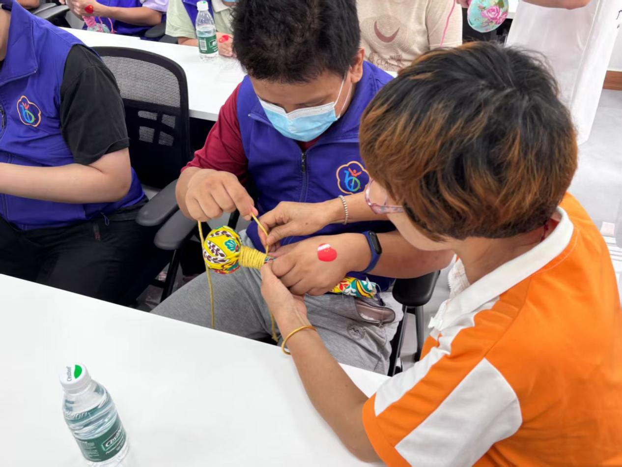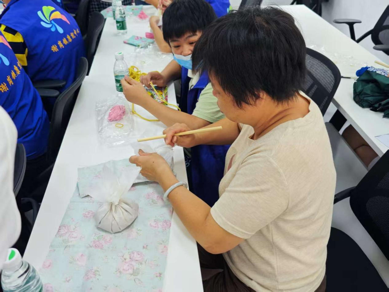 有些社区成员的父母也耐心地帮孩子扶着布袋,手把手教他们制作艾草锤,温柔地纠正着孩子的动作。当一个个鼓鼓囊囊的艾草锤完成时,大家看着自己的成品,脸上都绽放出灿烂的笑容,眼里满是喜悦与自豪。
