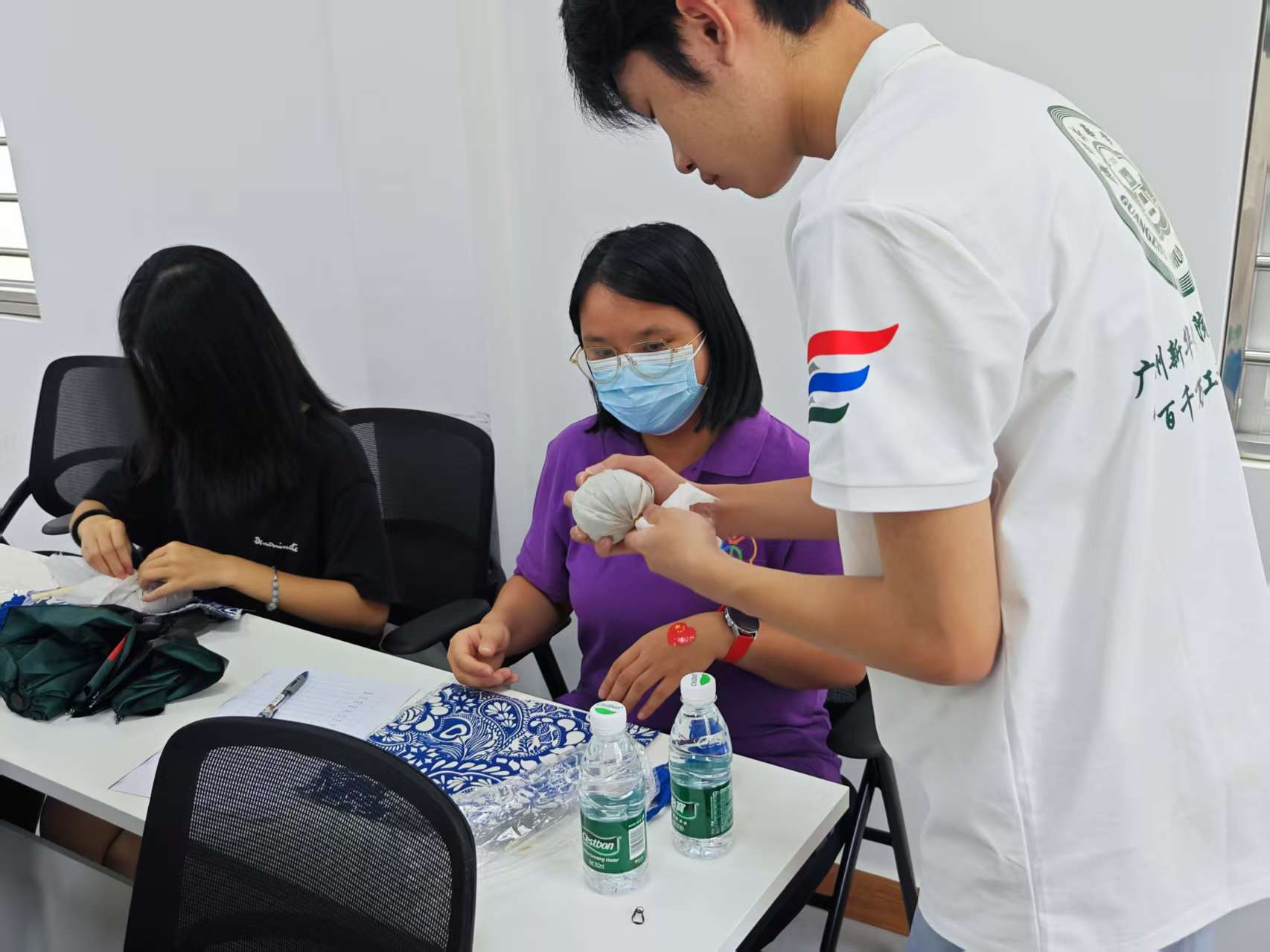 “大家摸摸看,晒干的艾草要揉得像棉花一样软,做出来的锤子才舒服呢。” 突击队的同学举起手中的材料,笑着演示起来。从拿起艾草包,再到拧紧绳结,每一步都讲得慢声细语。谁要是没看懂,同学就俯下身手把手教,善意的温暖混着艾草香,轻轻落在每个人手心里。