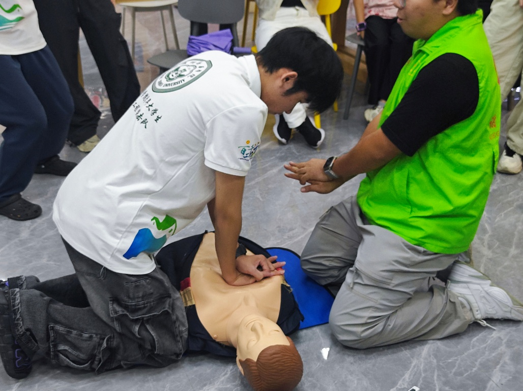 随后,讲师以互动演示的形式向志愿者展示了“海姆立克急救法”的操作流程,教授各位在面对异物堵塞呼吸道、尤其是儿童与老年人窒息时,如何快速、安全地展开急救。队员们积极参与实操演练,在模型人上进行心肺复苏动作练习,不断纠正细节,提升操作熟练度。
