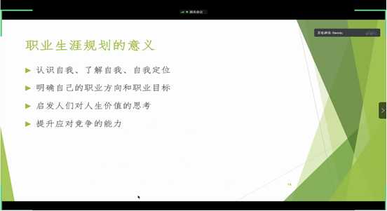卢老师首先阐述了职业的含义:职业是指人们从事的相对稳定的、有收入的、专门类别的工作,反映了个人与社会两个方面的内容。卢老师用丰富的人生经历阐释了大学生就要做好职业生涯规划的重要性。在卢老师看来,职业生涯规划的意义在于认识自我,明确自己的职业方向和职业目标,启发我们对人生价值的思考,从而提升应对竞争能力。