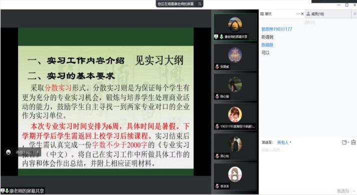 康星华老师结合学校的相关规定与要求,结合太阳成集团122ccvip实习要求,向同学们详细讲解了实习工作内容,并提出任务和建议。一、本次实习采取分散式实习,实习效果将作为必修课程计入学生成绩档案;二、要完成实习任务,按照学院规定完成实习报告、周记、每天系统打卡等;三、实习过程中要善于思考和学习,掌握和总结工作的内容和流程,把专业知识充分地运用到实习工作中;四、强化安全意识和遵守纪律。