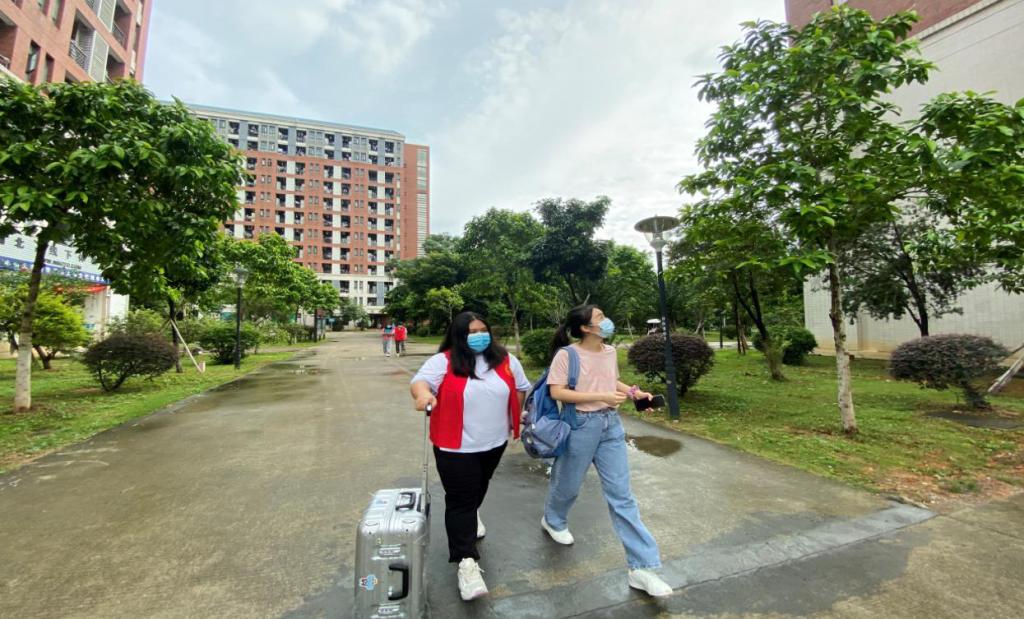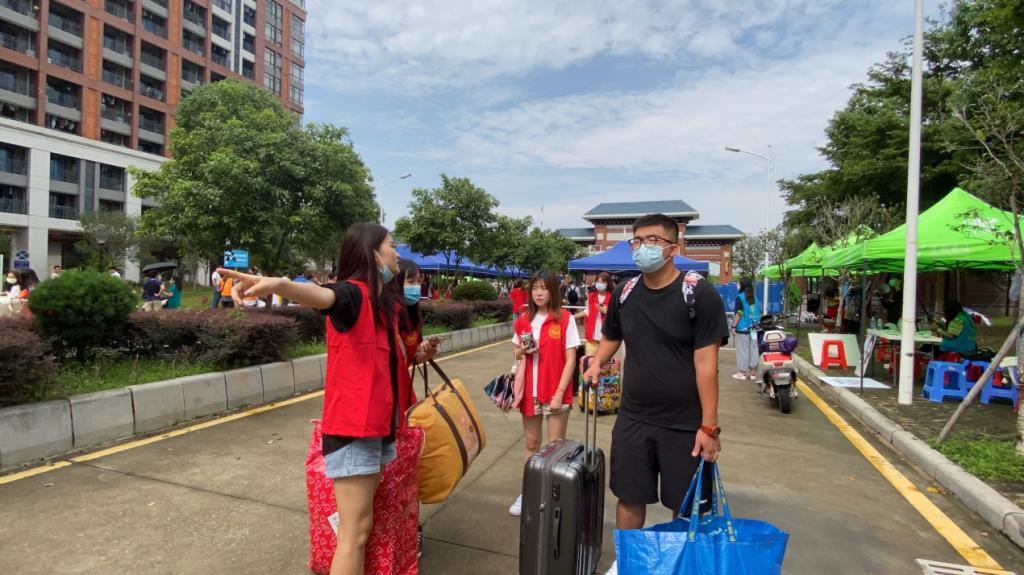 在前往宿舍的途中,作为志愿者的学哥学姐们热心地为学弟学妹介绍校园环境美丽的校园,使新生们不住惊叹旅途疲劳一扫而光,露出青春洋溢的笑脸