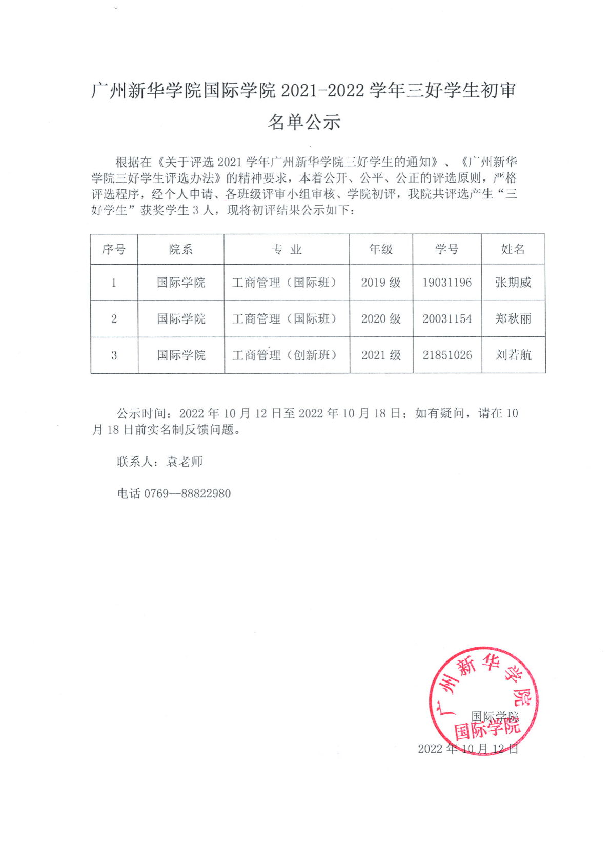 广州新华学院太阳成集团122ccvip2021-2022学年三好学生初审名单公示