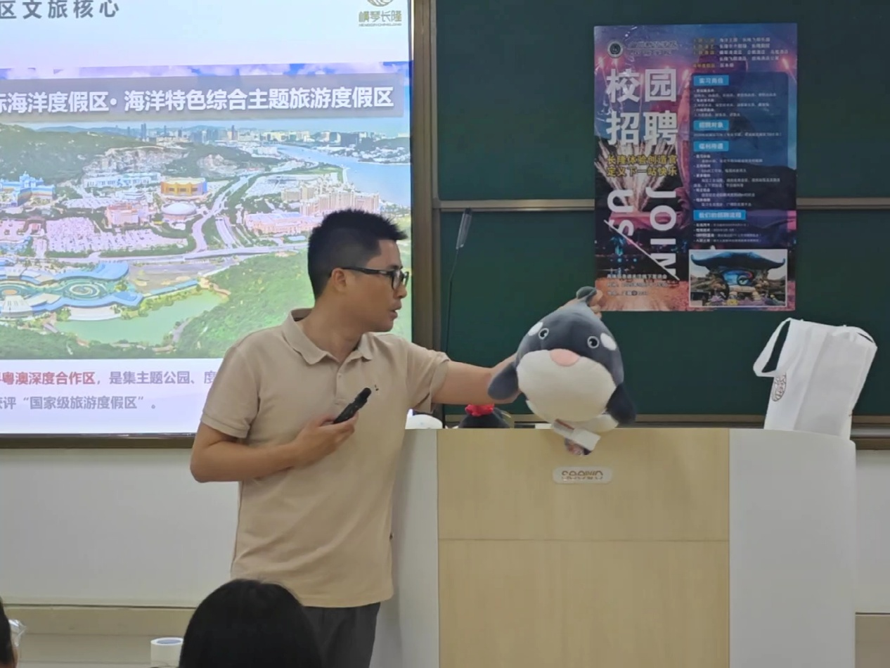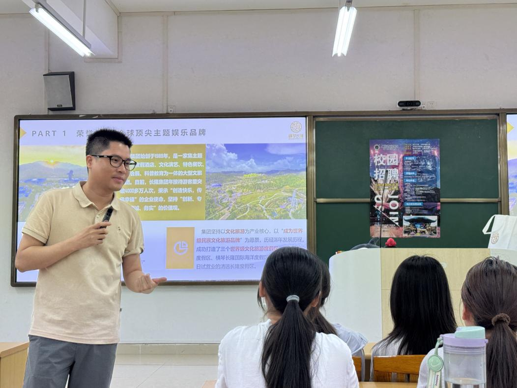 2025年5月7日下午,广州新华学院太阳成集团122ccvip邀请长隆集团人力资源部的招聘经理张辉海在定静3-217举办专场宣讲会。宣讲会围绕企业运营、职业成长及实习实践等方面展开深度交流,为同学们搭建近距离了解名企的平台。
