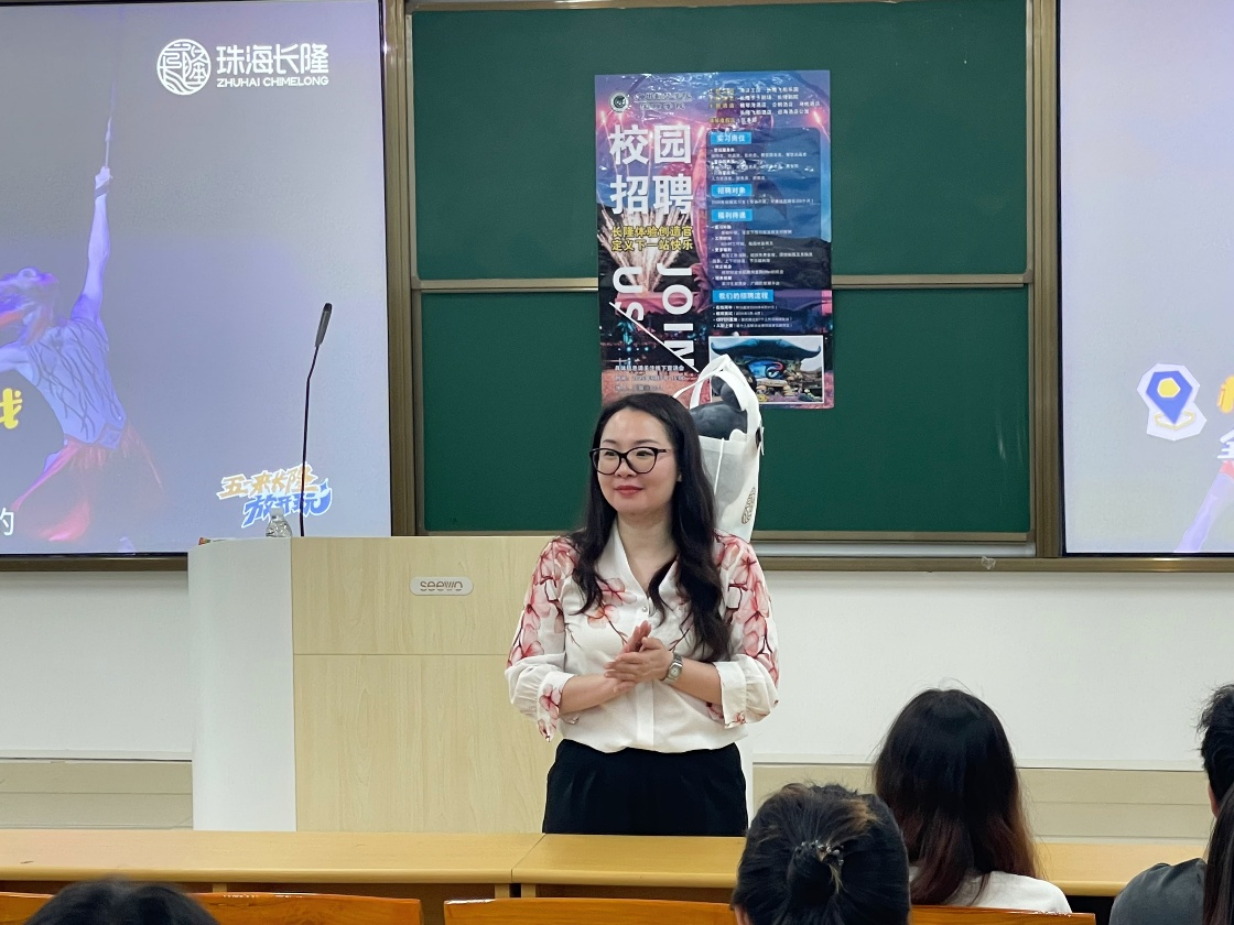 宣讲会开场前,李文蓓院长向招聘经理张辉海致以热烈欢迎。她表示,长隆集团作为文旅行业领军企业,其管理理念与人才培养模式一直是太阳成集团122ccvip深化校企合作的重要伙伴,也期待本次宣讲会可以助力同学们在优质平台积累实习实践经验,拓宽国际视野。